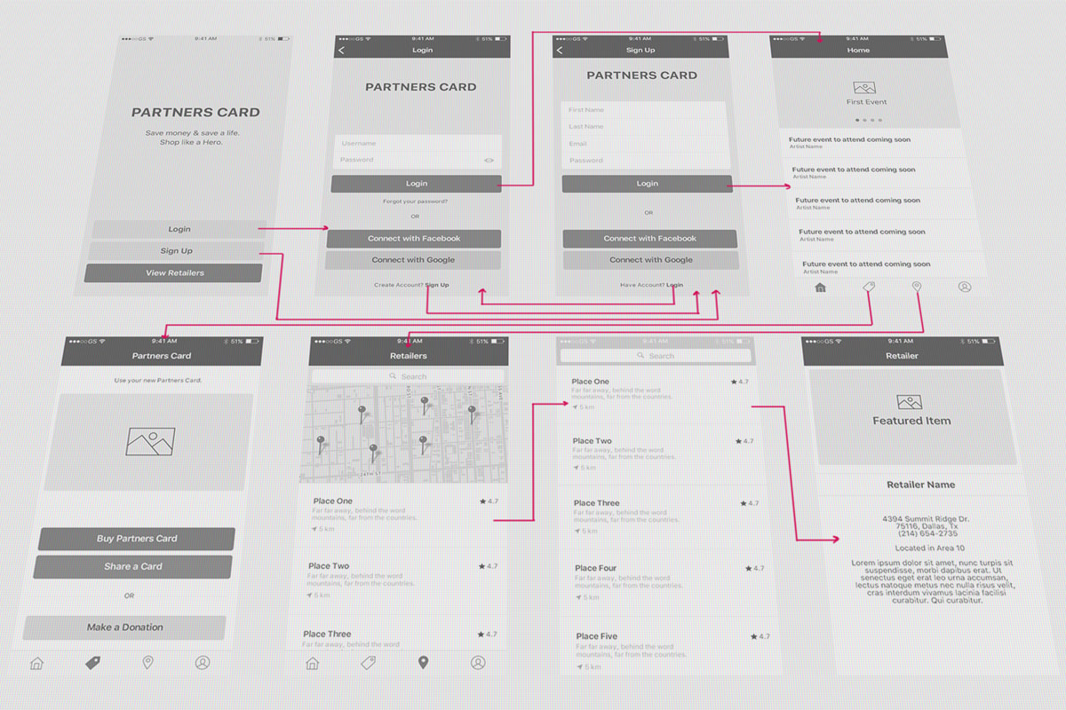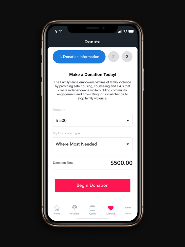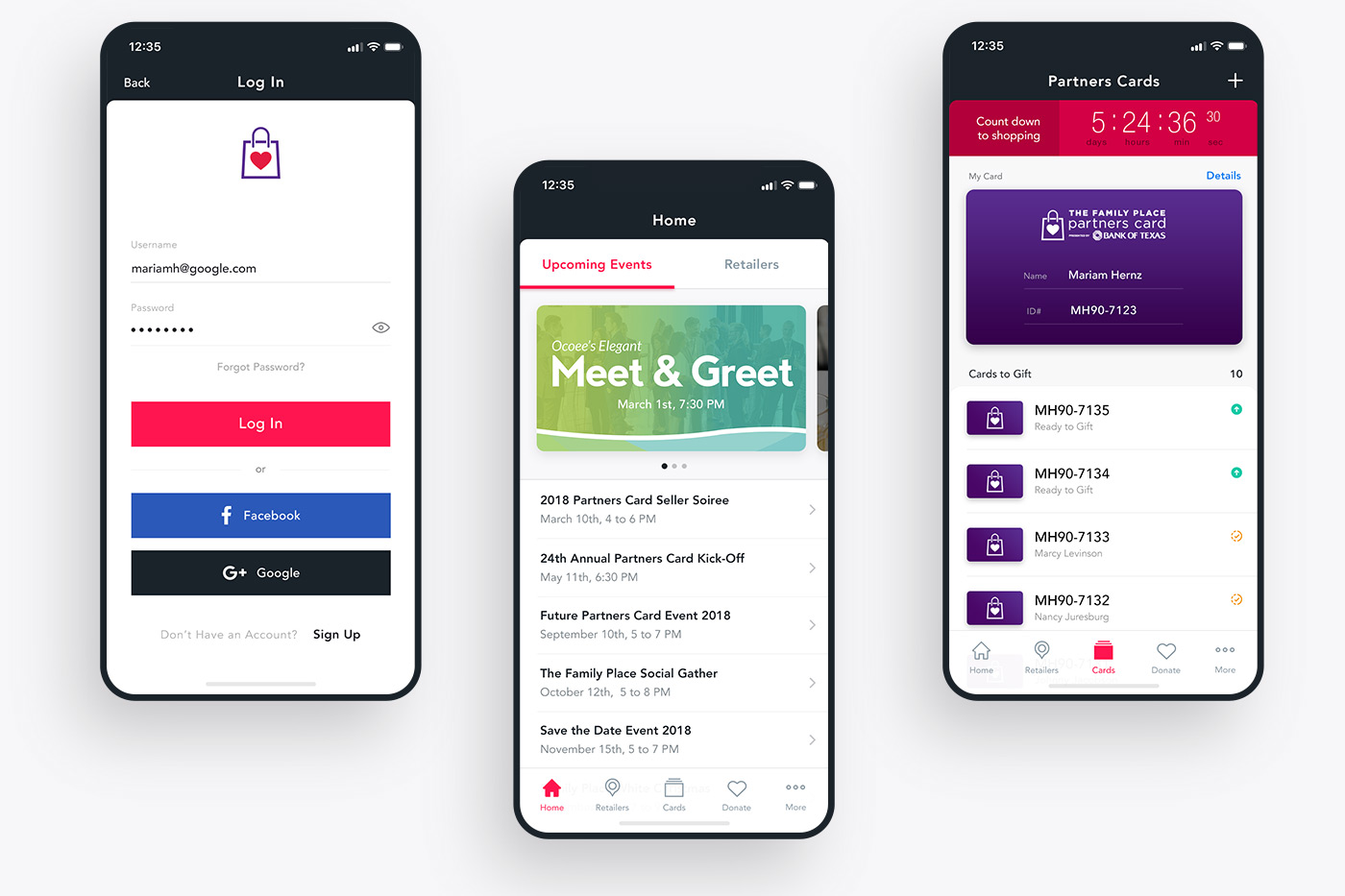 After a better understanding of The Family Place infrastructure, the UX, the design team produced a mobile app for iOS and Android that would allow users to not only purchase a Partners Card and easily find participating retailers but also allowed The Family Place to transition traditional “paper” cards into the mobile app while seamlessly requesting additional donations. After a second year, both the Android and iOS applications have allowed for increased purchases and donations.